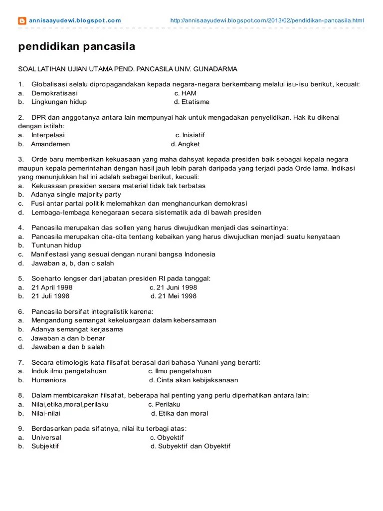 Pancasila, soal kewarganegaraan dan jawabannya, contoh soal implementasi pancasila, soal uas pendidikan kewarganegaraan perguruan tinggi . Mata kuliah pendidikan pancasila yang mencakup unsur filsafat pancasila,. Ujian tengah semester genap tahun akademik 2020/2021. Contoh pengamalannya di rumah dan di sekolah adalah: Perguruan tinggi dosen dan mhs merupakan bhg dari kek sosial dan masy .
